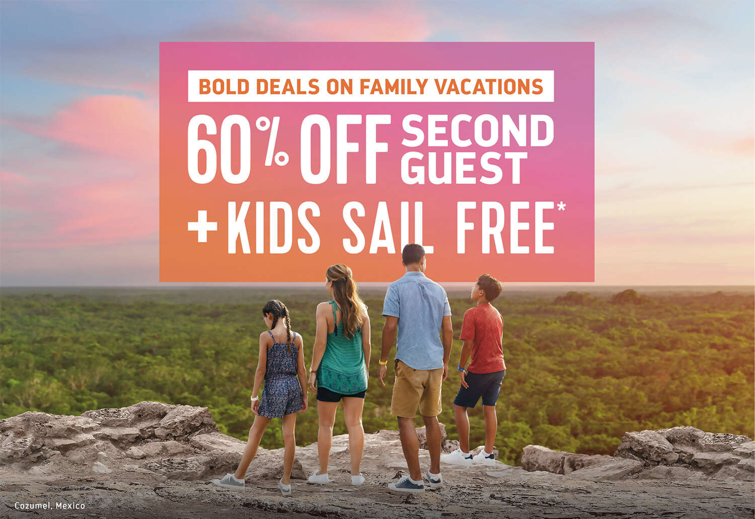 Unwind, explore, and indulge with deals too good to miss. Lounge beneath open skies with a cock tail in hand, dive into nonstop thrills on the top deck, or dance the night away under the stars. And with every journey taking you from iconic landmarks to hidden gems, this is your chance to make the getaway you’ve been waiting for. Right now, score incredible savings — like up to 60% off your second guest. Bring the whole family too — because kids sail free!*